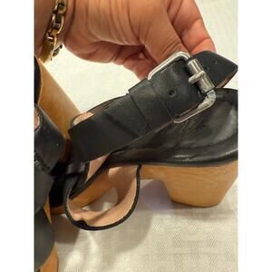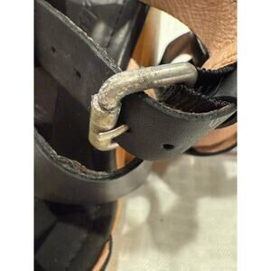 Easy as a wedge and totally sexy, this warm-weather sandal has a leather ankle strap and chunky wooden heel (read: supercomfy). Made to pair with sundresses and flares alike. This shows have never been worn but there is some damage on the buckles, please look closely.