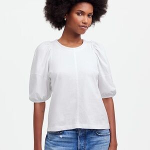 finished with special seaming details and raw-edge ruffle trim. Crafted of 100 percent cotton jersey, it has voluminous puff sleeves and a relaxed fit.