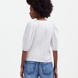 finished with special seaming details and raw-edge ruffle trim. Crafted of 100 percent cotton jersey, it has voluminous puff sleeves and a relaxed fit.
