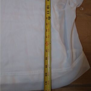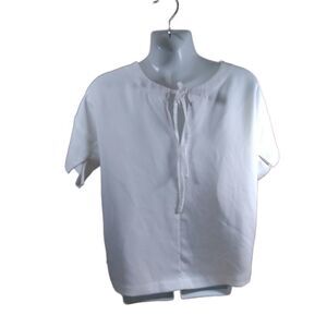 Nice substantial fabric, short sleeves with slit hem on sleeves. tie at back neck. EUC and measurements shown.