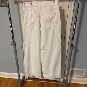Off white wide leg jeans with a high waist and deep cuff. Great in a business casual environment. Super wide leg style