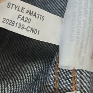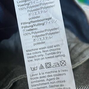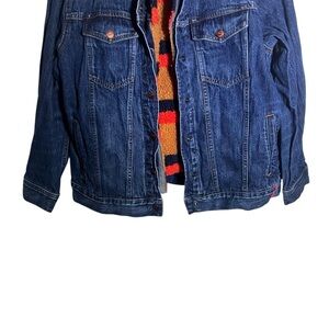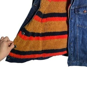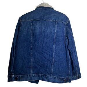 Blue, oversized denim jacket with a removable sherpa lining that can be worn on its own as a vest. Has an oversized, boxy fit. Preowned. Collar has some blue lint / fuzz from the vest on it. Otherwise in good shape.