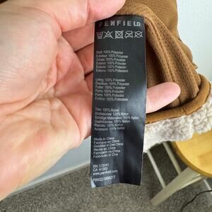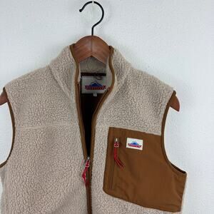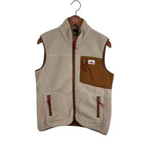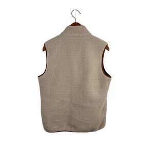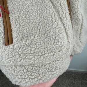 Sherpa fleece, full zip front, pockets, cream with brown accents, size large.