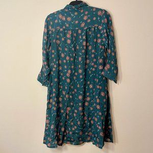 Unworn with tags! Soft, silky, teal green floral button-front dress perfect for fall. Pair with knee-high boots and a long lightweight jacket for a complete look. Comes with pockets!