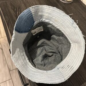 Stylish patchwork denim bucket hat. Features shades of blue for a trendy look.