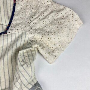 Cotton patchwork dress features square neckline, eyelet sleeves, button front.