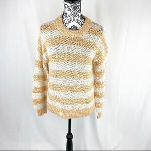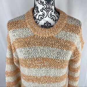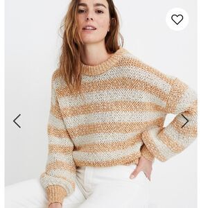 New with tags Madewell Baez sweater size xx-small. Orange and white striped open knit sweater with crewneck. Ribbed cuffs, collar and hemline. Cotton/wool/alpaca blend material (see tag for full makeup). Super soft and fuzzy! A little oversized!