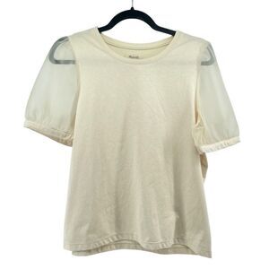 Madewell knit top, Madewell sheer sleeve top, Madewell women’s top medium, Madewell bleached linen top, Madewell short sleeve blouse, Madewell cotton blend top, Madewell casual top, Sheer sleeve knit blouse, Bleached linen shirt women, Madewell medium shirt, lightweight, feminine, elevated basic, neutral tone, breathable fabric, semi-sheer, minimalist style, chic casual, Madewell sheer sleeve knit top medium