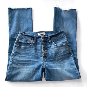 Lean and modern with a mini-flare, works with flats and heels alike. Has a high 9 1/2" button-front rise, distressing and a frayed raw leg hem. In EUC.