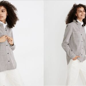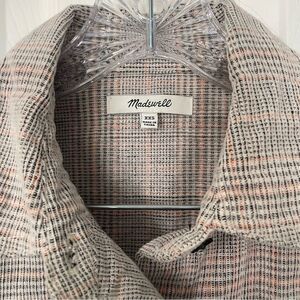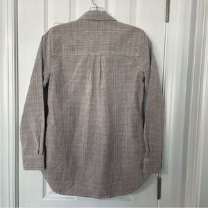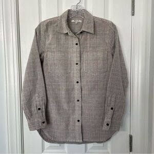 Madewell women’s corduroy classic ex-boyfriend shirt in a plaid check pattern. Features button front closure, two chest pockets, long sleeves with button cuffs, and a relaxed fit. Size XXS. Made of 95% cotton, 5% polyester. Lightweight, soft corduroy fabric in neutral tones — perfect for layering.