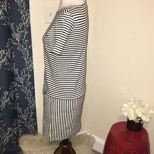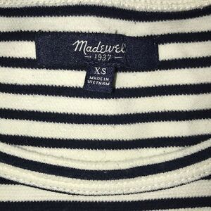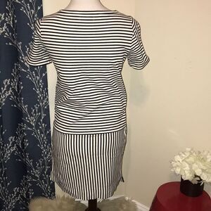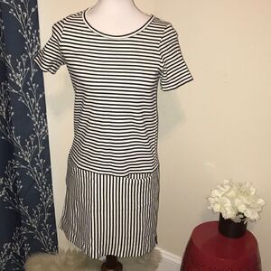 Great, preloved condition. Madewell Dockside T-Shirt Dress. Black and white stripes. Short sleeves. Drop waist. Front pockets. Slight pilling.