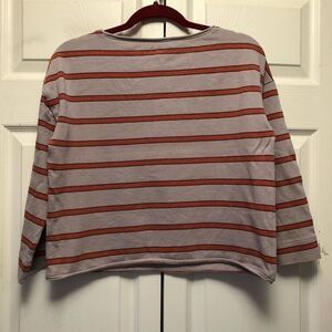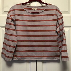 This sweater is in excellent pre-owned condition. The bottom is a tad rolled up but it is just from the laundry. It is gray and orange. It is cropped and would look great with high waisted jeans!