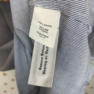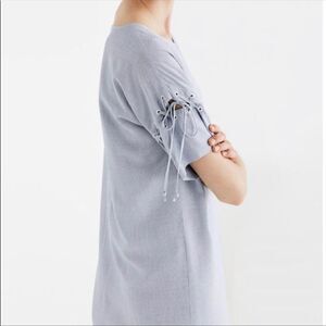 •Features: Thin blue and white striped shirt dress with lace up sleeve detail. Slip on style - jewel neck - unlined