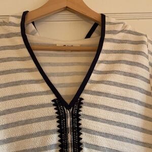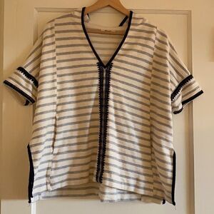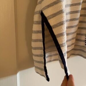 Great condition, cozy oversized top with hood. Cream and gray stripes with navy blue trim.