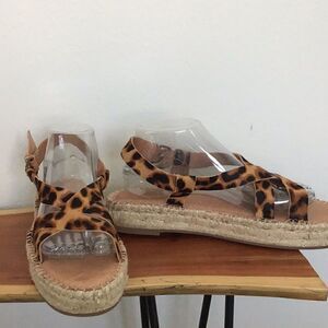 Supercuts and comfy ,these espadrille sandals have classic jute soles ,Asymmetrical leopard calf hair straps for a modern twist. Cloud lift lite padding for added comfort.