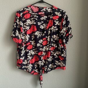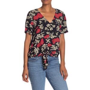 A femininely chic floral print adds a pop of color to this signature short sleeve blouse with a trendy tied front and classic V-neckline. Fit: this style fits true to size.. V-neck. Short sleeves. Slips on over head. Tie front. Floral print. Woven construction.