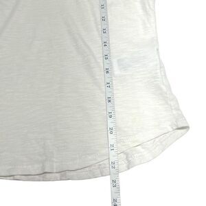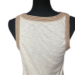 Features and details: some stretch, lightweight, semi-sheer, tan and white striped ringer accents on neck and arm holes