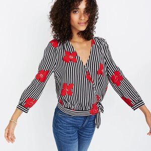 this borrowed-from-the-'70s top ties at the side for a wrap vibe. Wear it over a cami or let the flowers-and-stripes print shine solo.