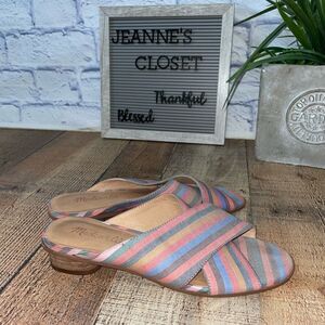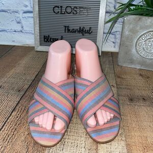Made of rainbow striped fabric, these slip on mules have low cylindrical wooden heels and foot hugging crisscross straps : bonus, they are lined to be soft against the skin. Cushiness alert: we’ve added an extra layer of padding to make them even easier to wear.