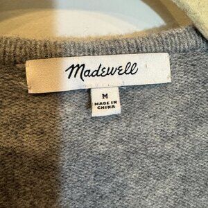 This Madewell Ryder cardigan sweater is a size Medium in a colorblock design featuring shades of gray. It is made from a blend of polyamide, alpaca, and wool, with a tight-knit fabric type. The sweater has long sleeves and requires hand washing. Perfect for the Fall and Winter seasons, this cozy and colorful cardigan is a stylish addition to any wardrobe, with a regular fit that is comfortable for everyday wear.
