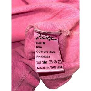 Authentic Madeworn Rolling Stones band tee in a soft pink, size medium. Features the iconic Rolling Stones tongue logo with an American flag and “Steel Wheels Tour ‘89” graphic on the front. Made in the USA from 100% cotton with intentional distressing for that lived-in, vintage feel. RN139225. A must-have for collectors and fans of true rock style.