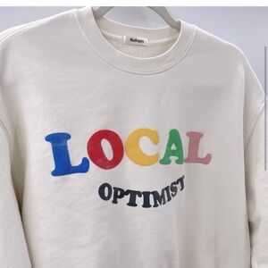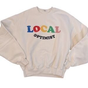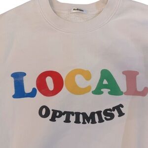 Spread good vibes in this bestselling Madhappy Local Optimist crewneck sweatshirt. Crafted from soft fleece, this cozy white pullover features the bold “LOCAL OPTIMIST” rainbow lettering across the front. A cult-favorite brand known for its limited drops, this piece is perfect for lounging, layering, or streetwear styling.