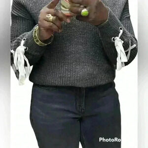 Madison And Berkeley Gray Sweater with White lace up on sleeves. Size small. In great condition