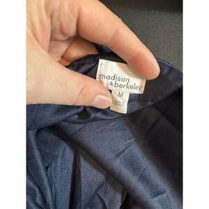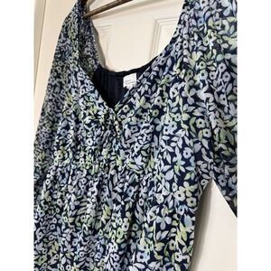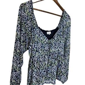 This is a Madison & Berkeley navy blue blouse with a floral pattern, long sleeves, and a V-neckline. It has an empire waist with ruched detailing and a tie closure, giving it a fairy or pixie character. The blouse is a size Medium and features a sheer fabric.