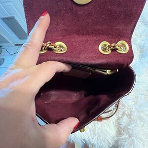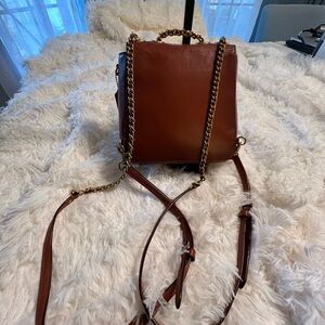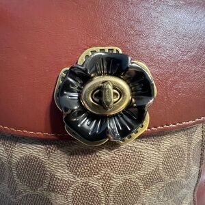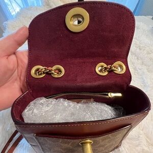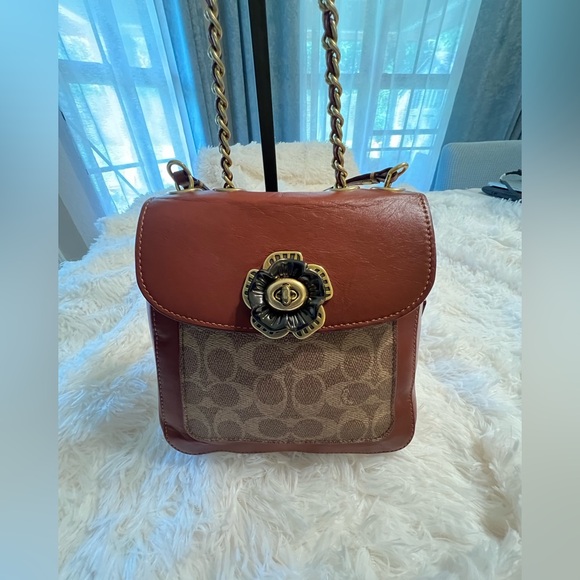 This Coach crossbody/backpack bag features a classic design with a structured shape, showcasing the signature monogram print in brown and tan. The elegant contrast of colors and the gold-tone turnlock closure add a touch of sophistication, making it a versatile choice for everyday use.