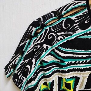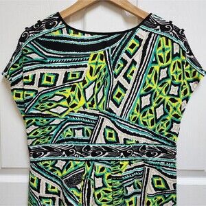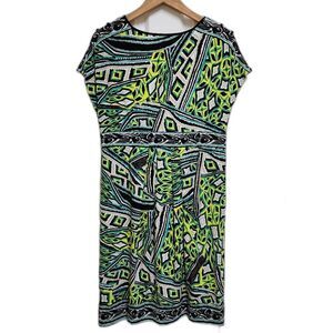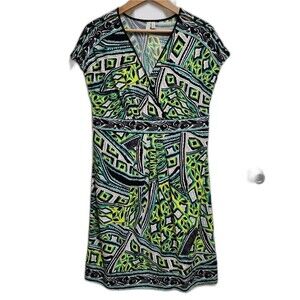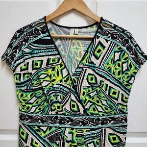 Madison Dress Sz XL Teal Yellow Black Abstract Surplice V Neck Stretchy Cap Slv