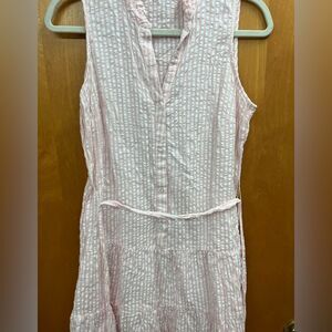 Elegant pink and white striped top. Features ruffled neckline. Perfect for casual wear.
