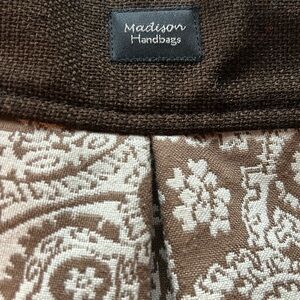 Madison Handbags shoulder bag. Comfortable to wear on your arm. I don’t believe this company is in business any longer but their bags last forever!