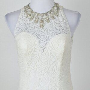 Lace overlay. Halter style neckline edged with beads and Swarovski crystals. Open v-back. Back zipper and buttons. (Did not button for the photos to not add any extra wear, no issues). Padded bust with boning in bodice. Fitted through bust and hips. Sleeveless.