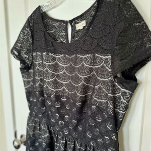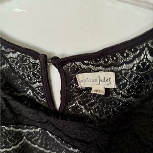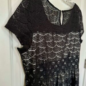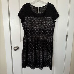 Madison Jules lace dress with polka dot lining. Darts at bust and back, gathered waist. Keyhole closure on back. Gently worn, excellent condition.