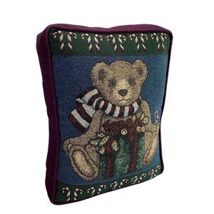 Amidst the twinkling glow of holiday lights, a charming teddy bear nestles comfortably on this festive pillow. Its woven tapestry design, accented with candy canes and gift boxes, invites warmth and cheer into any room. This cushion becomes a timeless companion during the joyful season, adding to the magic of Christmastime.
