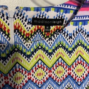 The Madison Leigh Sleeveless Shift Dress in size 16 features a fun and whimsical Chevron pattern with bright tasseled accents, making it perfect for parties, weddings, or even casual workwear. This knee-length dress is made from a comfortable and stretchy blend of polyester and spandex, with a round neckline and a unique hook & eye closure. The colorful and vibrant design is ideal for summer, fall, and spring seasons, adding a touch of bohemian flair to your wardrobe. Vintage-inspired and eye-catching, this dress is a statement piece that is sure to turn heads.