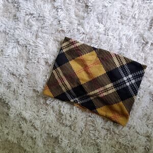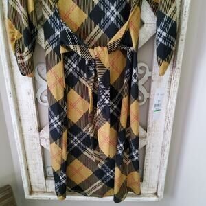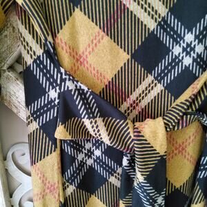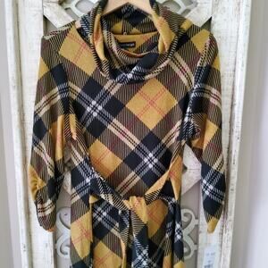 Mustard yellow, black, red 3/4 gathered sleeve, sash tie wait belt, removable cowl neck shift midi dress by Madison Leigh in a size Large.