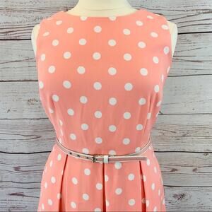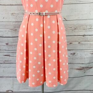 Adorable peach and white polka dot dress with belt. Fit and flare a-line style with POCKETS! Lined bodice, rear zipper with hook and eye. Stretchy material, skirt has pleats. Size 14