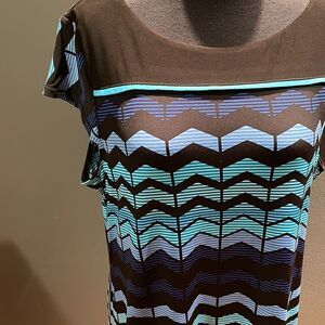 Madison Leigh blue, turquoise/black stretch zig zag pattern shift midi. Small cap sleeves. Solid black bodice, hem band, and yoke. Pullover. Size 12. Polyester/spandex blend. Excellent condition. Nonsmoking home.