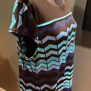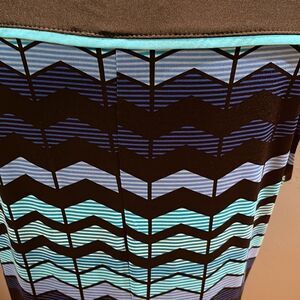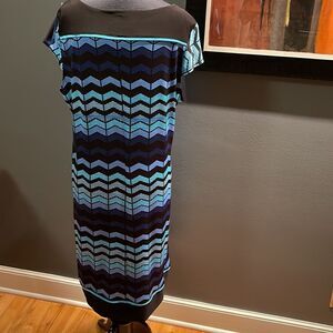 Madison Leigh blue, turquoise/black stretch zig zag pattern shift midi. Size 12.