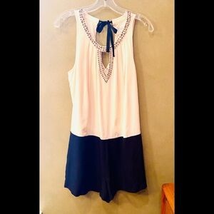 Embroidered scoop neckline, ties at keyhole back. 100% silk, back zip.