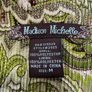 Step into style with this Madison Michelle paisley print jacket, showcasing a vibrant mix of green, brown, and white tones. Made from lightweight polyester with a textured ribbed fabric, this jacket is perfect for adding a retro-boho vibe to your wardrobe. Featuring a zip-front closure, collared neckline, and tailored silhouette, this versatile piece works for both casual outings and dressier occasions. The intricate paisley pattern adds an artistic flair, making it a standout piece for any wardrobe.