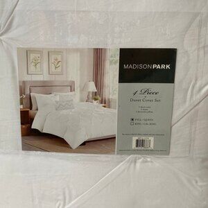 Madison Park NWOT 4 Pc F/Q White Duvet Cover Set with Grey and Beige Trim Glam