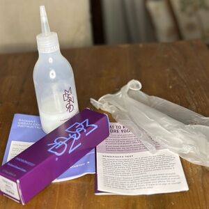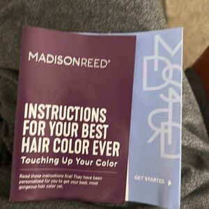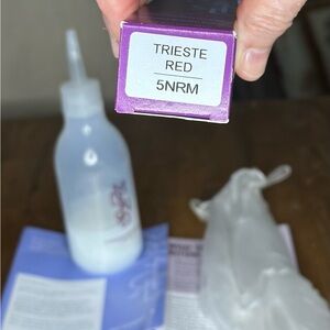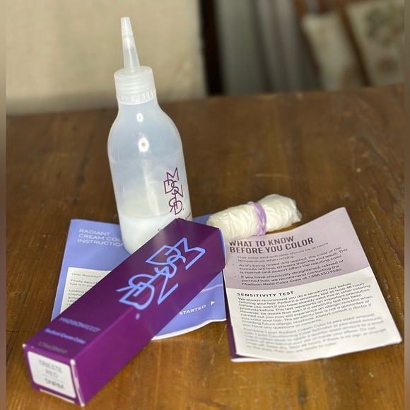 Madison Reed hair color package. Color is Trieste Red 5NRM, includes: color activator, color, gloves, skin barrier cream (not shown) and the instructions.