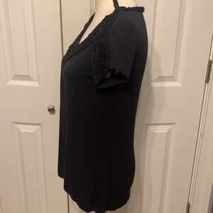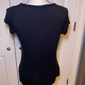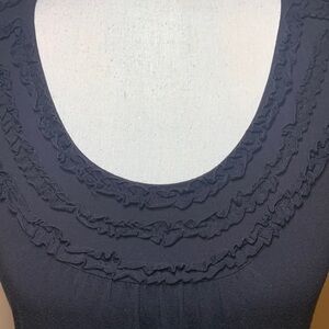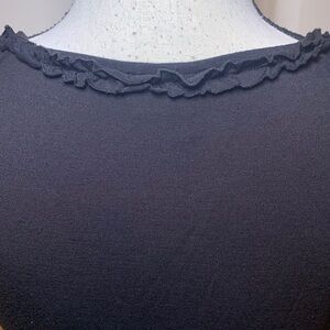 Gently used super soft top. Ruffling detail at collar to sleeves. Short sleeve Rayon/Spandex. Size S Color Black 16” PTP & 25.5” L. No rips, stains or tears.