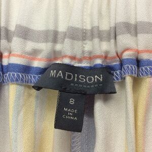 These Madison shorts are perfect for any casual or activewear occasion. The colorful vertical stripes and pleated front create a classic style, while the high rise and pull-on closure provide comfort and ease of wear. The blended fabric of viscose and lyocell make these shorts lightweight and perfect for summer. Plus, the added bonus of pockets make them practical for any adventure. Available in size 8 and from the brand Madison, these shorts are a must-have for any wardrobe.