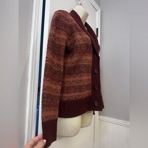Cozy up in style with this Madison Studio women’s cardigan in size small. Made from a luxurious blend of 88% wool, 11% angora rabbit hair, and 1% nylon, this cardigan offers exceptional warmth and softness. Featuring a geometric knit pattern in warm shades of burgundy and brown, it has a shawl collar and a button-front closure for a classic, timeless look. Perfect for layering during cooler months, this cardigan is both stylish and functional. In excellent pre-loved condition. Keywords: Madison Studio cardigan, wool angora sweater, geometric knit cardigan, cozy winter layers, vintage-inspired cardigan.