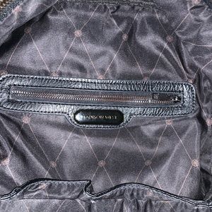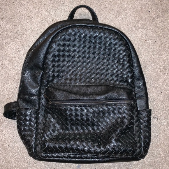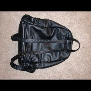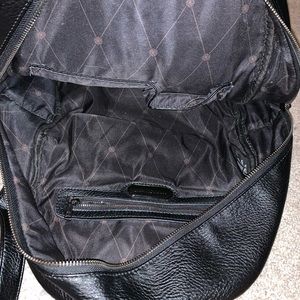 Black leather. Many compartments for all you need. Used for one month for school still very good condition