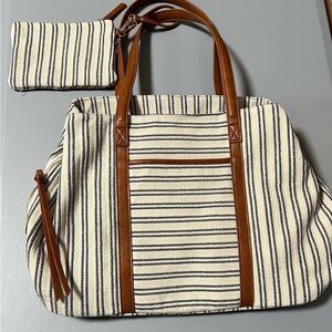 Madison West overnight tote bag with sidekick pouch. White with black stripes and tan accents. Separate snap and zipper compartments. Lots of storage. Excellent condition.