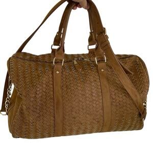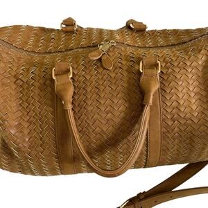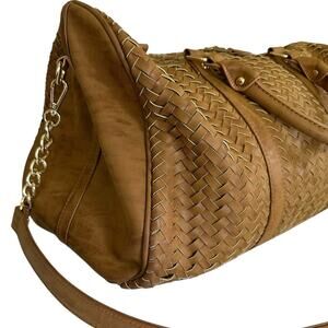 Weekender Travel Duffle Bag. Chic and versatile, this Madison West satchel features a beautifully woven faux leather design in a warm tan shade. Accented with gold-tone hardware, including a detachable chain-linked strap, this bag blends boho-inspired texture with modern sophistication. The spacious interior makes it perfect for everyday use, work, or travel.